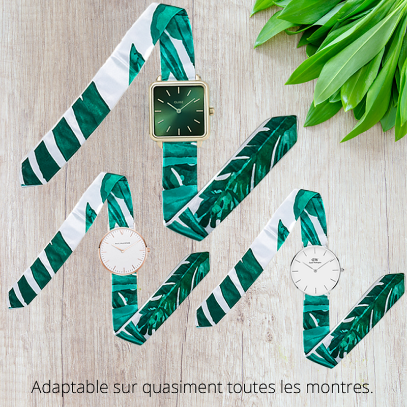 Combinada con los paisajes paradisiacos que nos hacen viajar, ¡esta pulsera de seda con motivo vegetal Gabriel RIVAZ sabrá resaltar tu muñeca durante tus vacaciones! Elige una pulsera de seda Gabriel Rivaz que sabrá resaltar tu muñeca.  Pulsera fabricada con una seda increíblemente suave y cómoda de llevar. Se adapta a todas las muñecas. Seda de 4,5mm de grosor para mantener la forma Herramienta profesional y robusta facilitada para retirar las hebillas fácilmente. Ya no necesitas ir al relojero. Hebillas de calidad (1.8mm de grosor) con pulsadores para una instalación fácil y muy rápida sin herramientas (de regalo). Instalación de la pulsera en menos de un minuto – Tuto disponible en la pestaña “cambiar su pulsera”