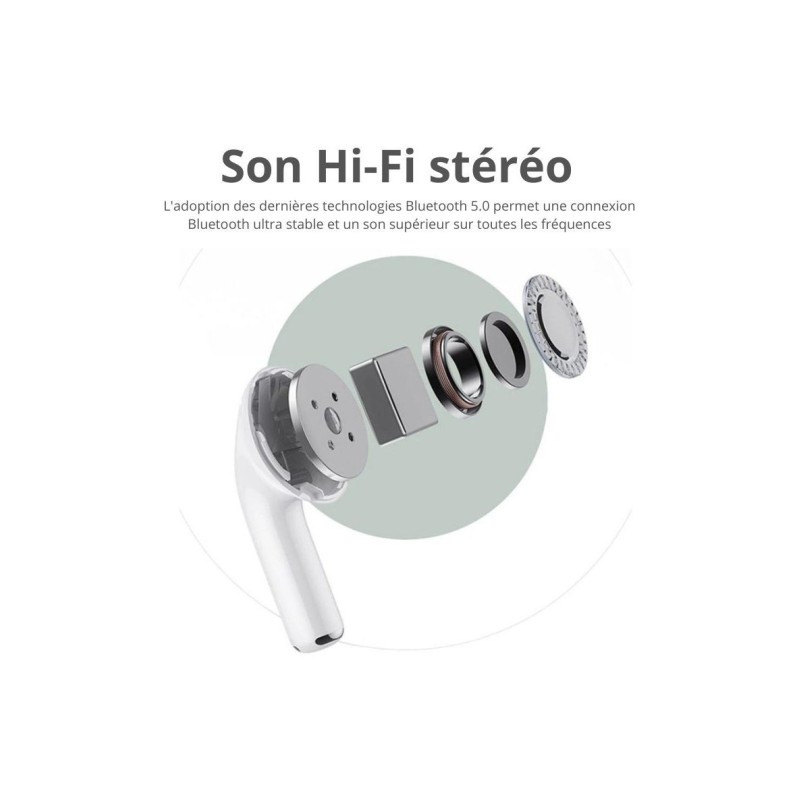Ces écouteurs sans-fil possèdent un son de haute qualité avec réducteur de bruit, et des contrôles ingénieux utilisant un bouton unique. Profitez de la technologie Bluetooth 5.0, produisant un son fidèle et précis sur toute la gamme sonore, avec tout le confort d'un kit écouteur sans fil, le tout sous un design discret et épuré.