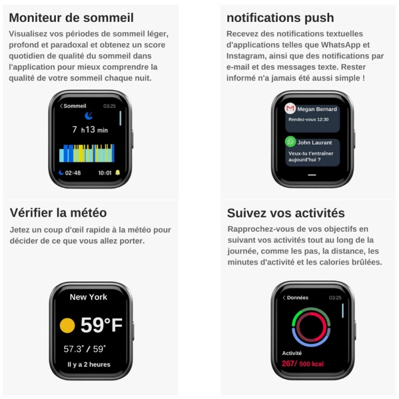 Nos montres connectées sont bien plus que des accessoires de mode. Elles sont équipées de toutes les fonctionnalités dont vous avez besoin pour rester connecté(e) et actif(ve) :